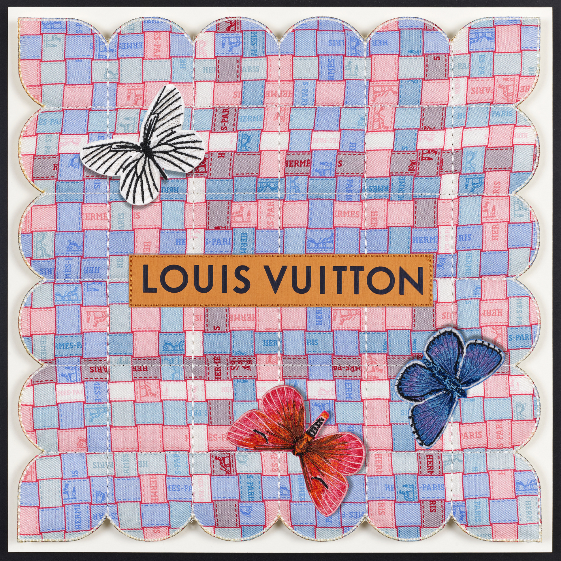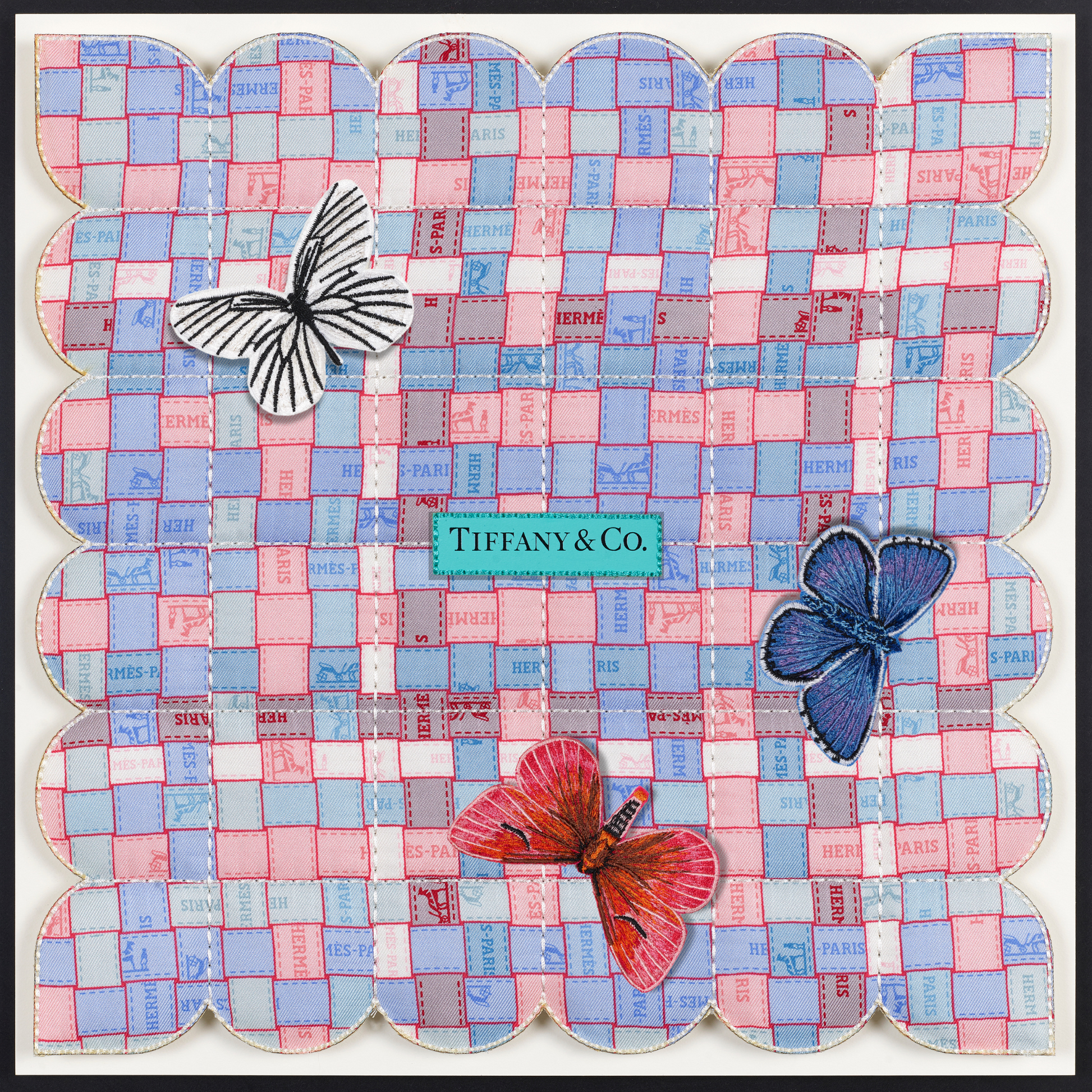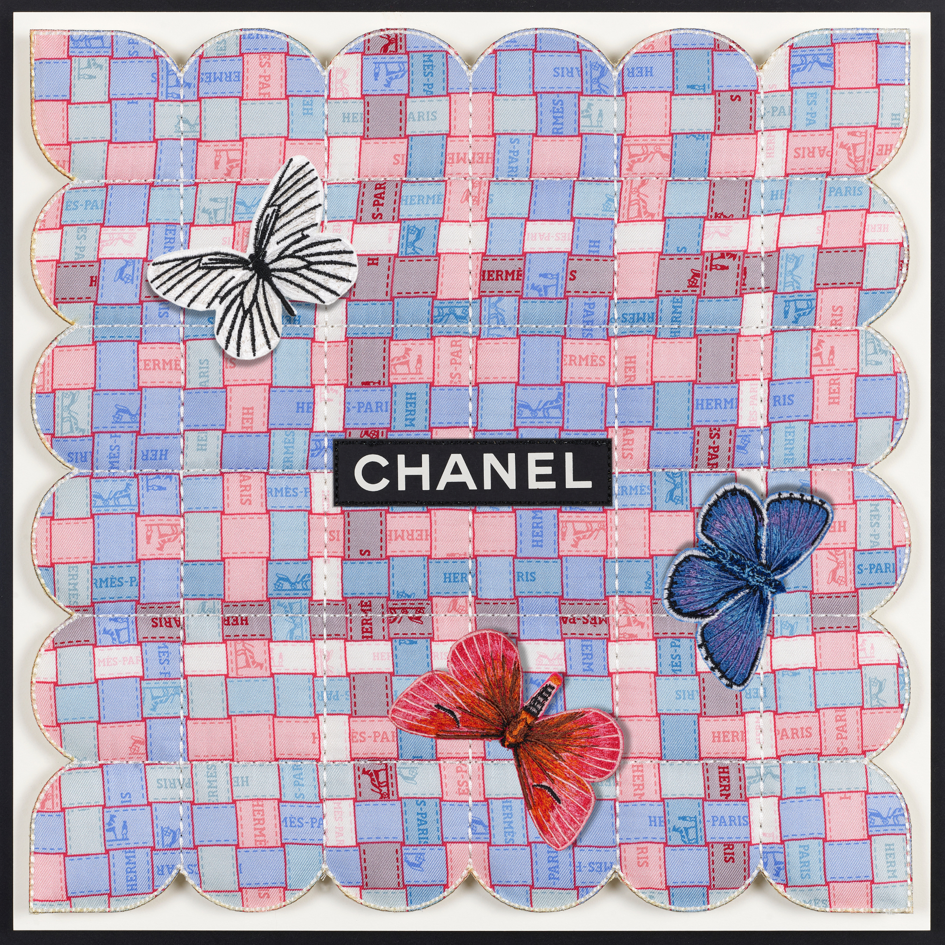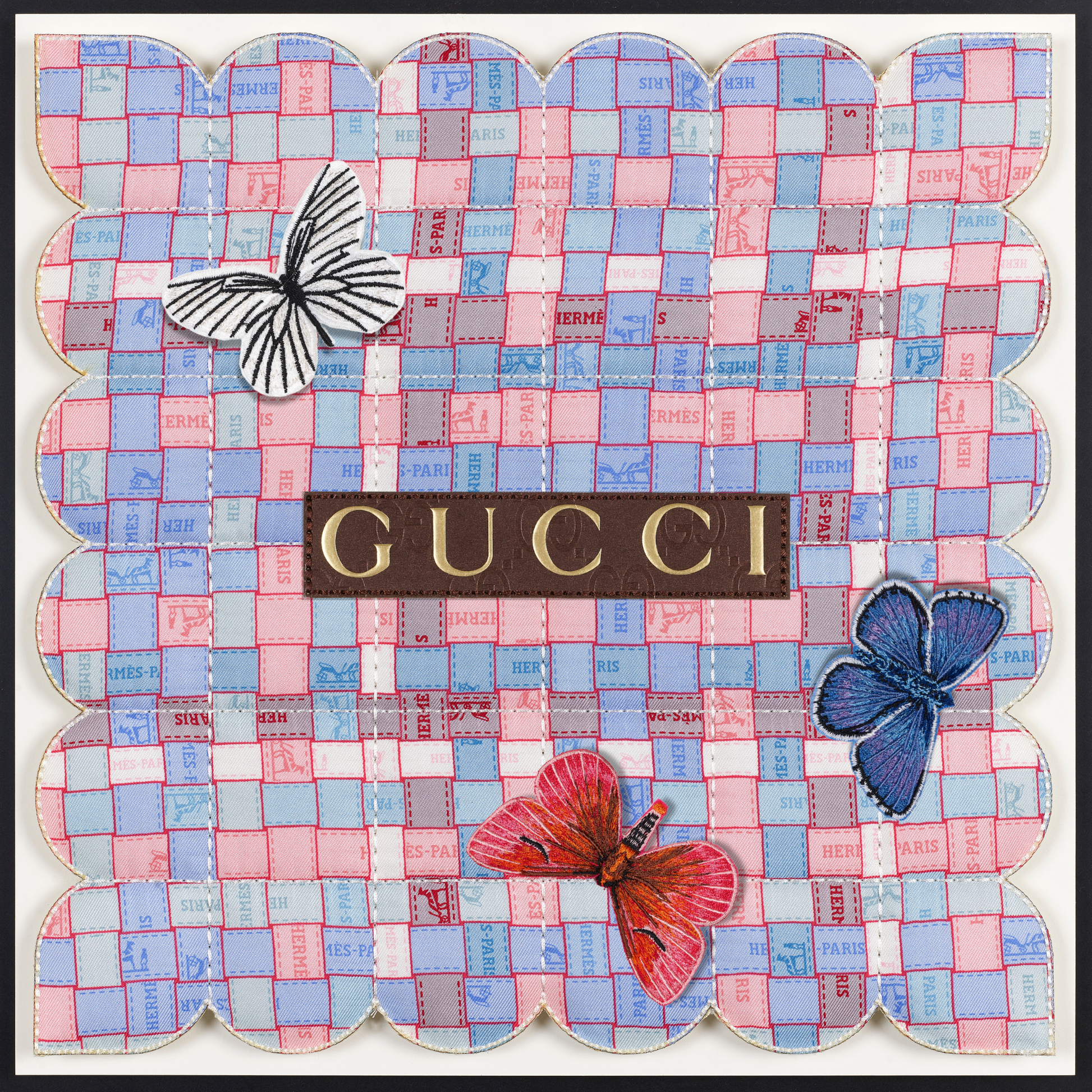 In a fascinating twist, the tapestries are also enhanced with thoughtfully selected up-cycled luxury packaging, merging high fashion with eco-conscious design. Delicate embroidered butterflies flutter gracefully across the surface, introducing an enchanting three-dimensional element that brings each piece to life. Every tapestry tells a distinct story, reflecting not only the beauty of the materials but also the thoughtful craftsmanship behind it. Due to their unique combinations and individual designs, these pieces are genuinely one of a kind, making them treasured works of art that resonate with both style and sustainability. Each tapestry serves as a testament to the innovative potential of up-cycling, inviting viewers to appreciate the intricate balance between luxury and environmental responsibility.