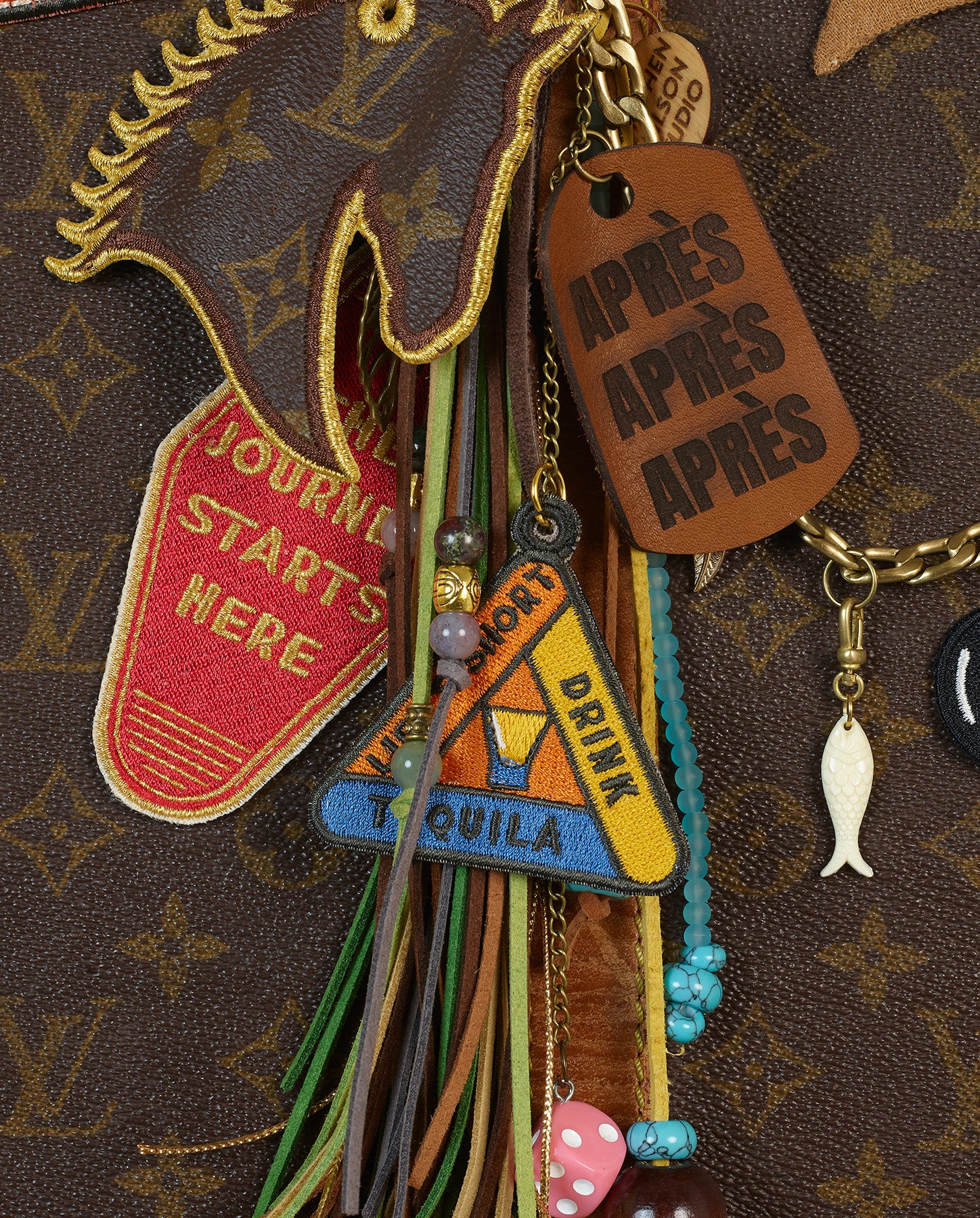 From there, the transformation becomes uniquely yours. Every bag is constructed differently, using embroidered patches, feathers, appliqués, leather dog tags, vintage chains, charms, beads, and small treasures collected over time. Nothing is ever duplicated. Each piece becomes a one-of-a-kind assemblage, guided by your choices and the details that matter most to you.