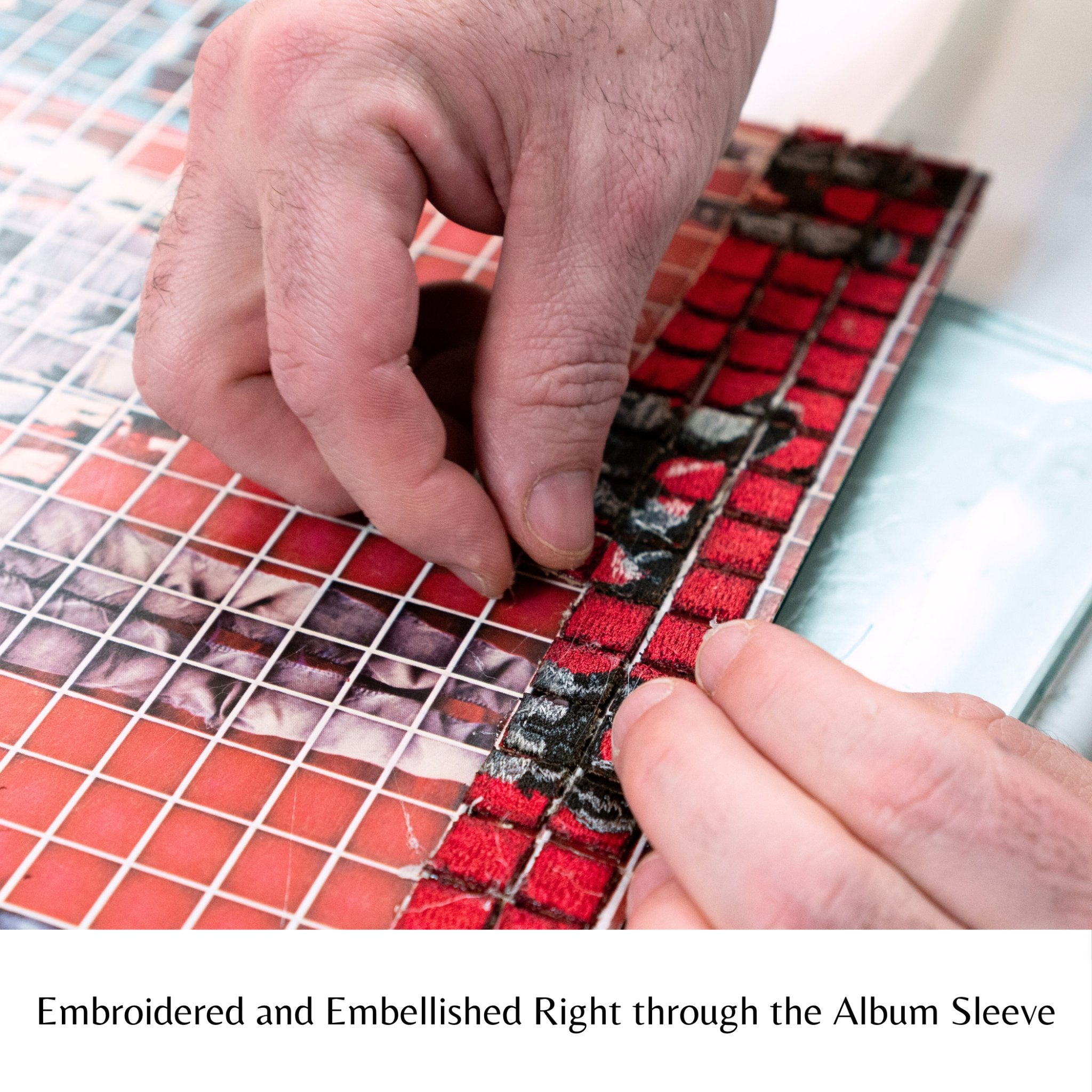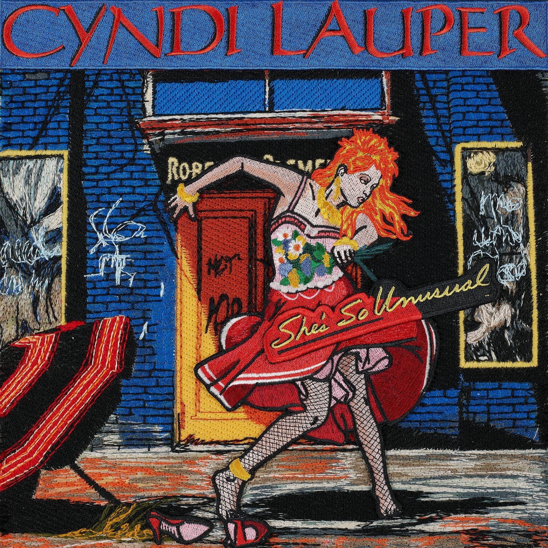 She’s so unusual was Cyndi Lauper’s debut album that was released in 1983. It contained four hit singles, won two Grammys, and sold over 16,000,000 copies worldwide. I grew up with two younger sisters who were fanatical about this album when it was released. I must have listened to Girls Just Want to Have Fun on repeat for two years straight. The album features Cyndi wearing what at the time would be considered an Avant-garde outfit dancing in front of a closed wax museum in Coney Island N.Y. The photograph was taken by Annie Lebovitz and is an amazingly composed shot. I used a technique for this album that I had previously used on the Beatles Abbey Road. I stitched the background of the album using multiple layers of wool thread stitched in free motion style, the style softens and blurs the background in warm textures. Cyndi and her shoes were created as a cartoon patch in bright colors and bold outlines. I love how she becomes a juxtaposition of color over the soft background. The logo as well as the album title were also created as patches and mounted onto the background as a final step.