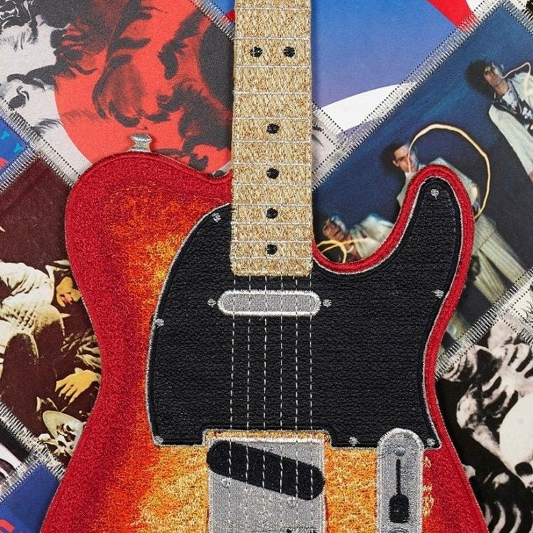 The guitar is embroidered with over 200,000 stitches and mounted in relief over the background.