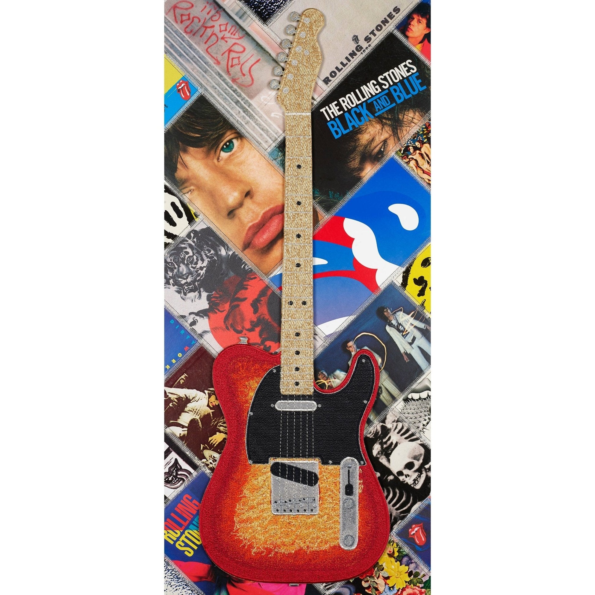 The St Elmo’s Fire piece is based on a Telecaster style guitar and it was embroidered in a red flame color. The background uses up-cycled Album covers that were collaged and embroidered into a vibrant background. Rolling Stones album covers were specifically chosen for this piece.