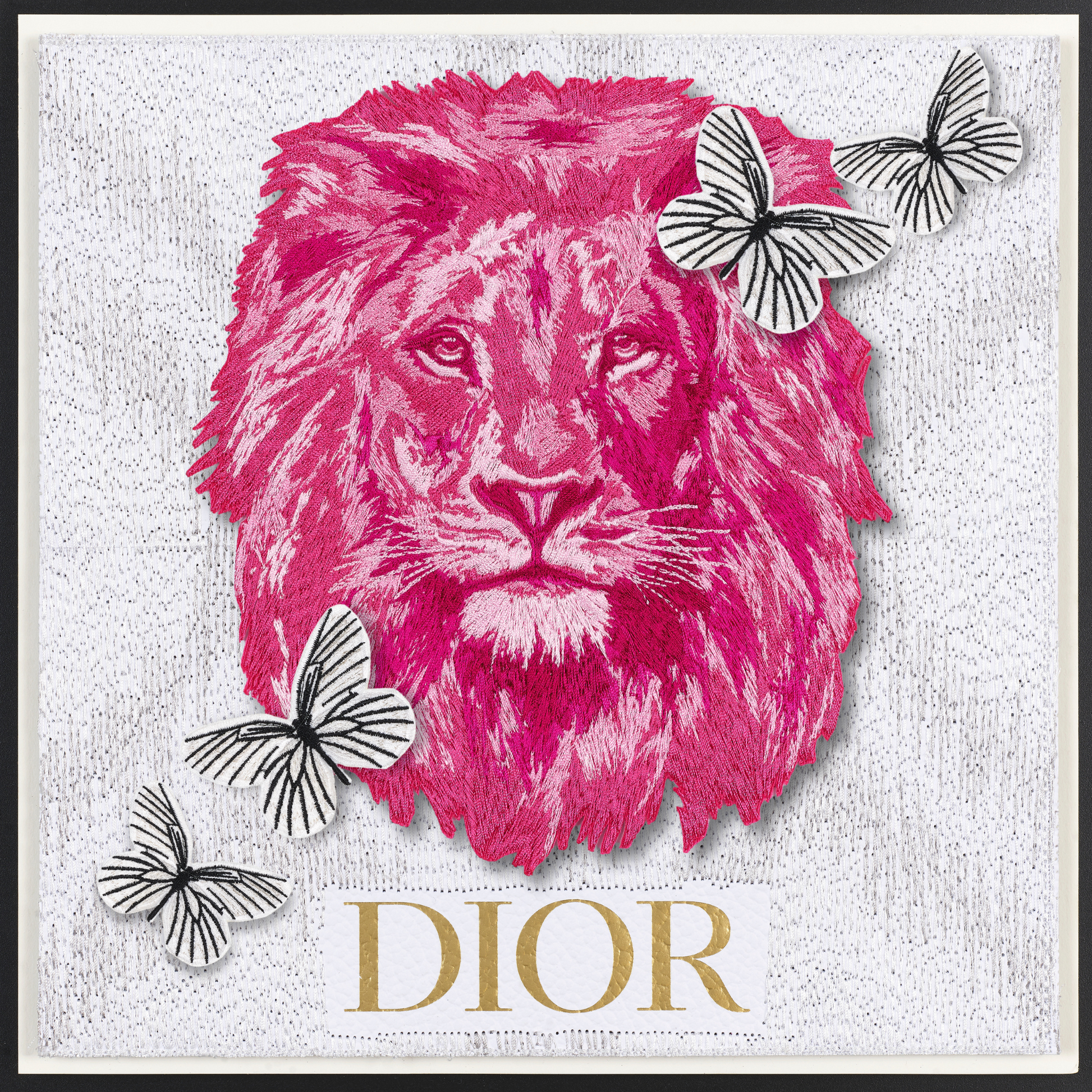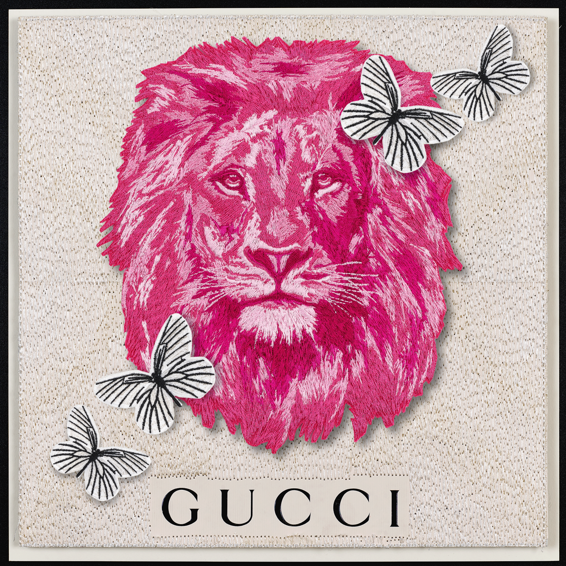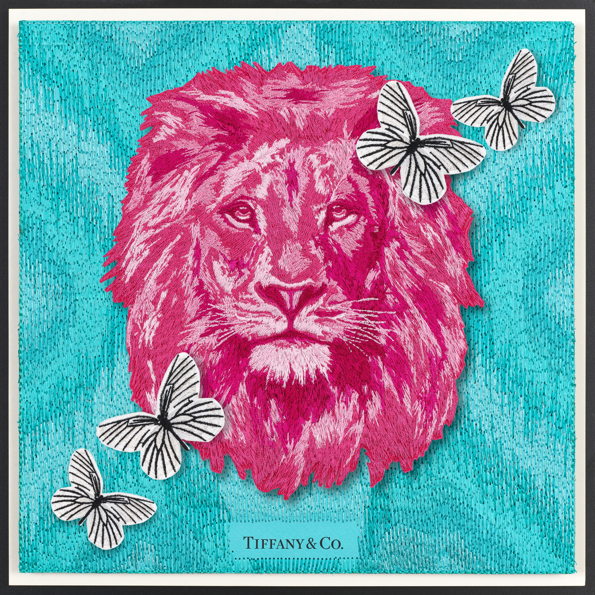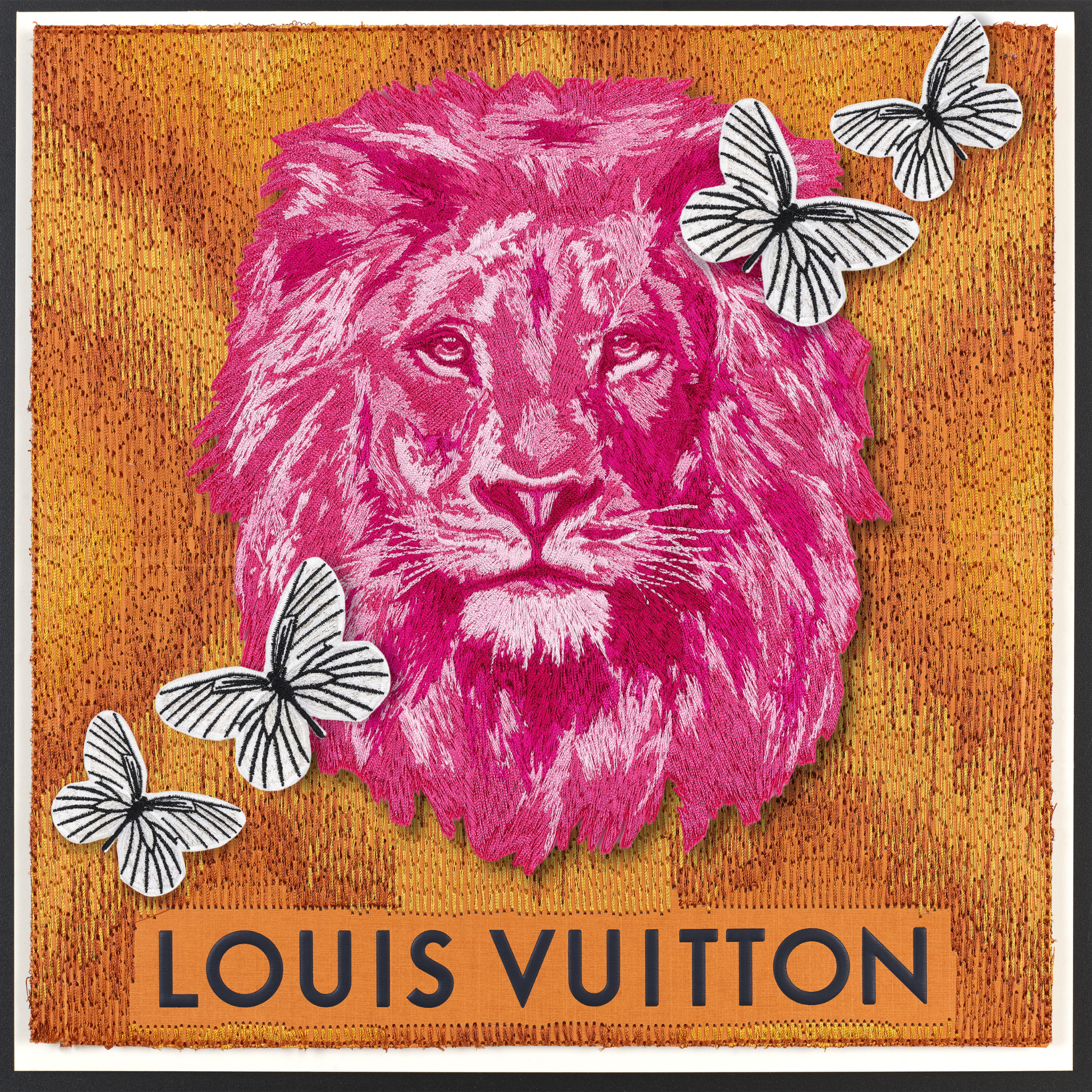 The work begins with the disassembly of luxury boxes and bags to create the piece's background. This background is adorned with a beautifully detailed pattern embroidered in harmonious thread tones. The Lion, symbolizing strength and wisdom, stands out as one of the studio's most beloved designs. Each stitch is meticulously hand-placed, using an array of colored rayon embroidery thread, with each lion featuring over 100,000 stitches. After the embroidery is completed, the Lion is mounted in relief on the background, and three-dimensional embroidered butterflies are added to enhance the overall composition.