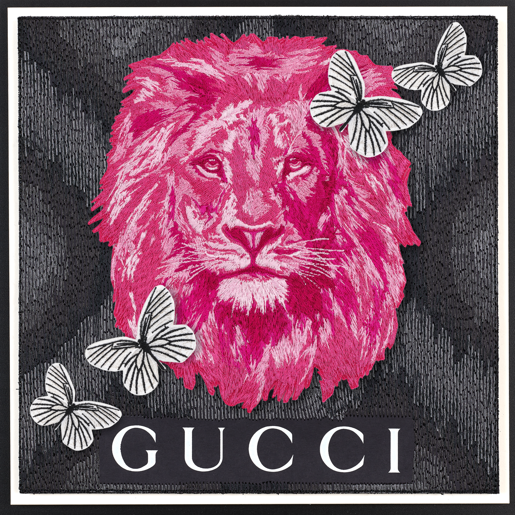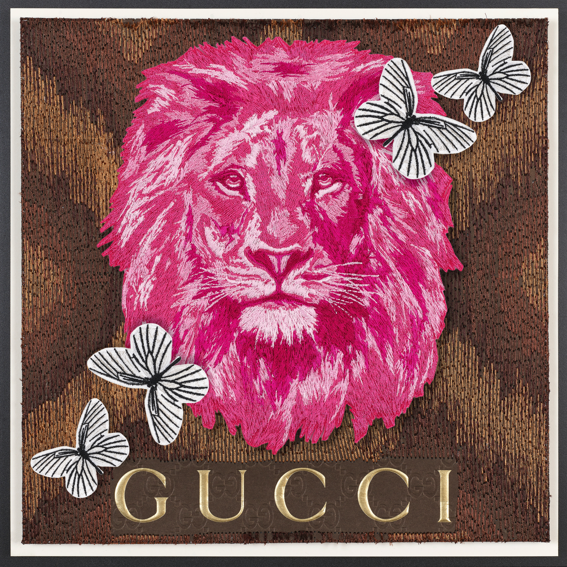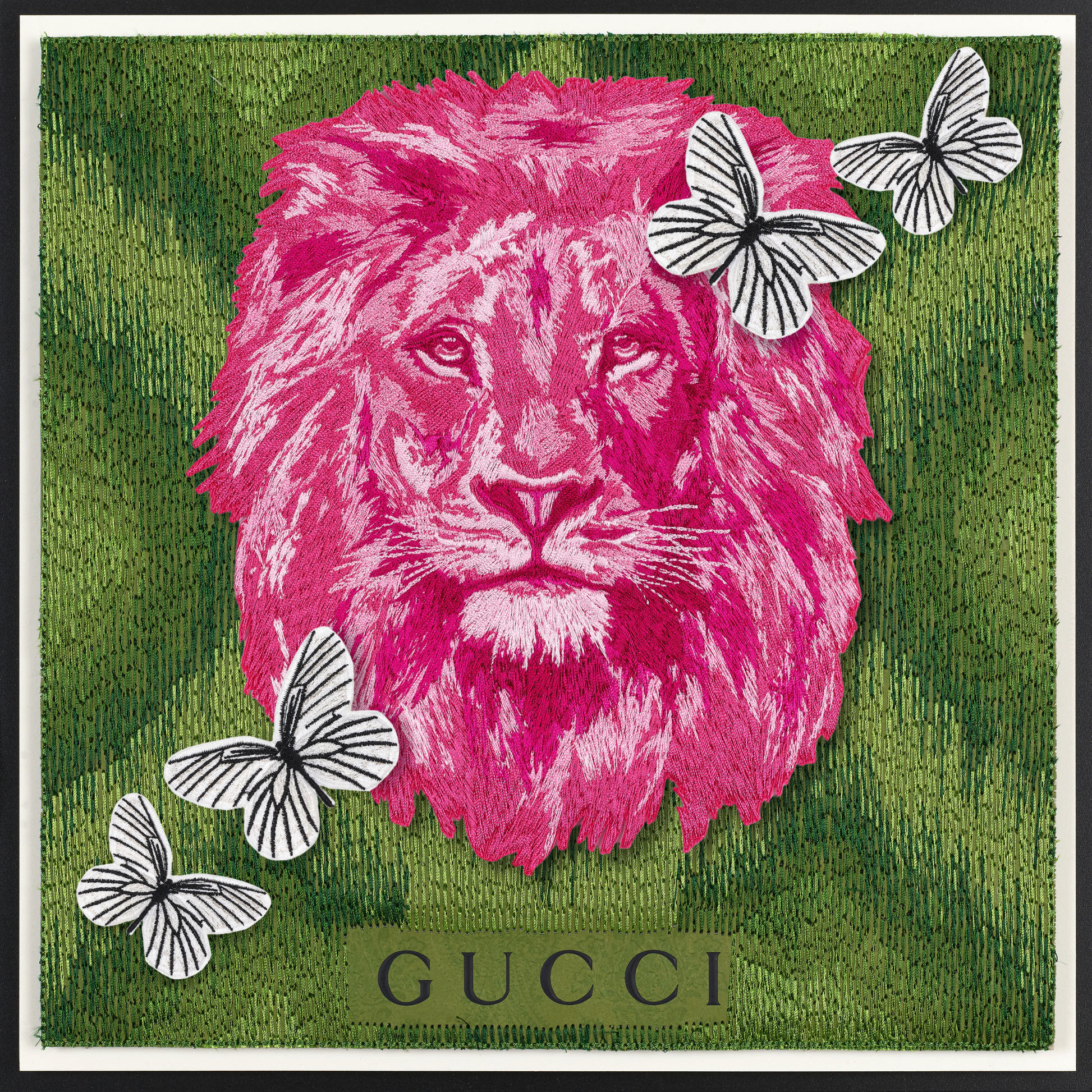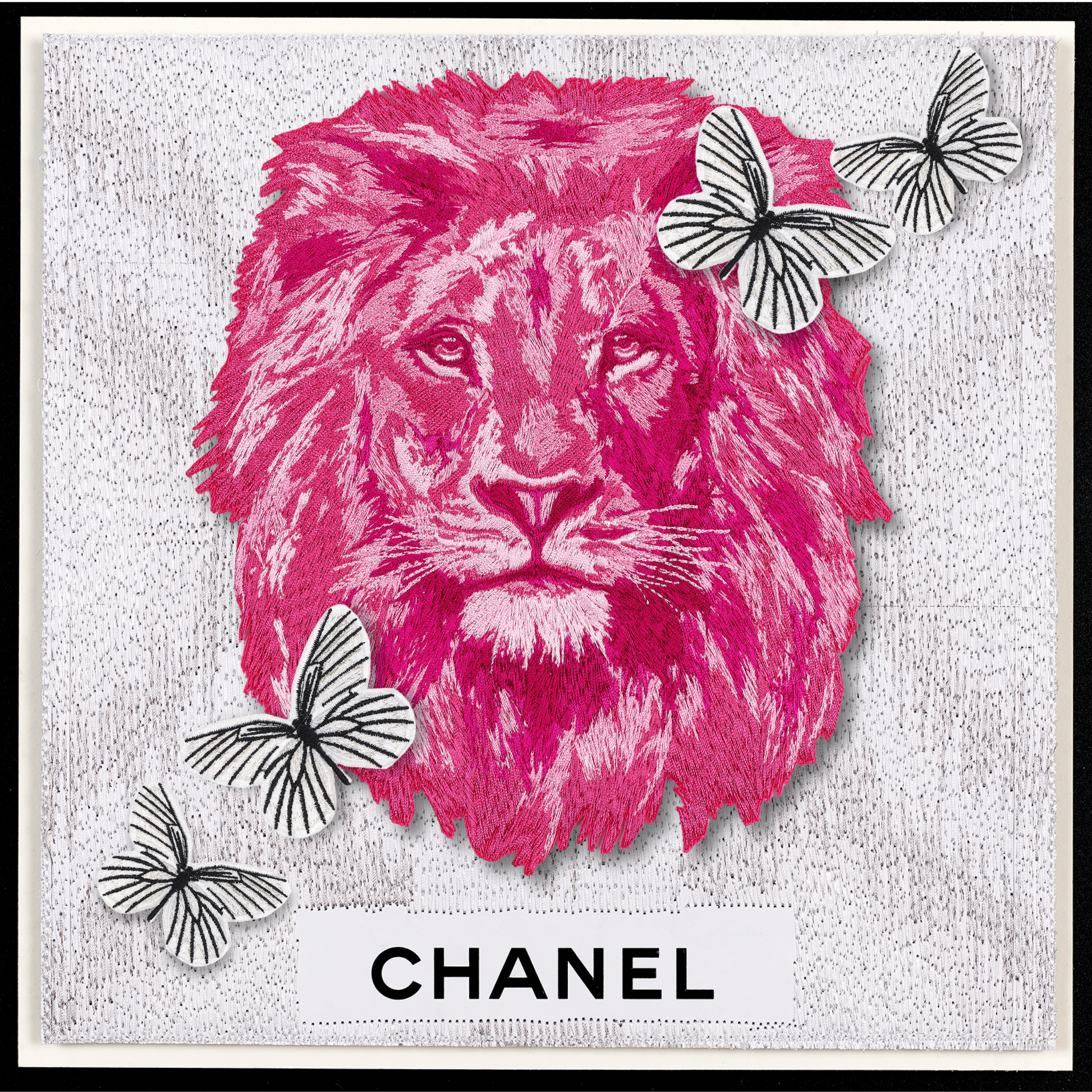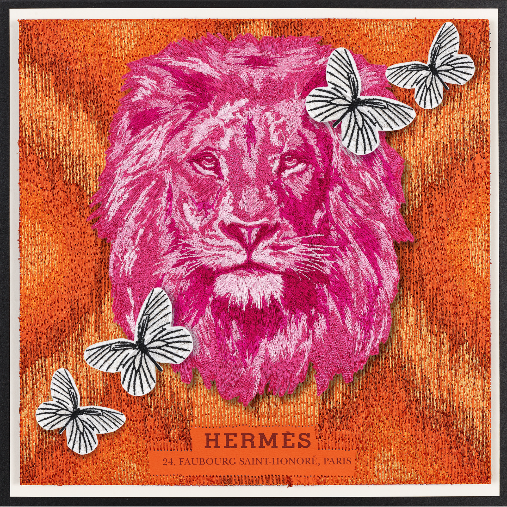 The work begins with the disassembly of luxury boxes and bags to create the piece's background. This background is adorned with a beautifully detailed pattern embroidered in harmonious thread tones. The Lion, symbolizing strength and wisdom, stands out as one of the studio's most beloved designs. Each stitch is meticulously hand-placed, using an array of colored rayon embroidery thread, with each lion featuring over 100,000 stitches. After the embroidery is completed, the Lion is mounted in relief on the background, and three-dimensional embroidered butterflies are added to enhance the overall composition.