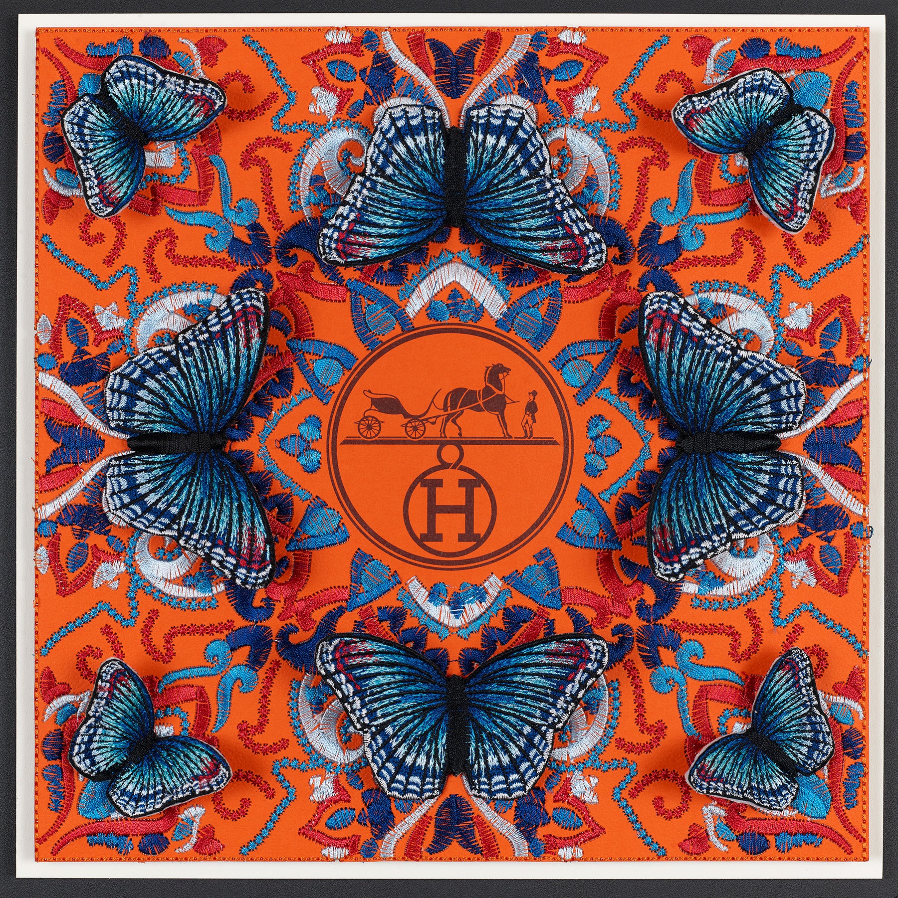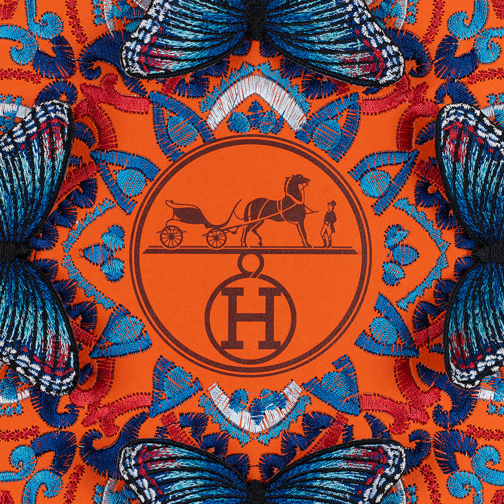The symmetry pieces were created by first designing and embroidering a vintage bandana pattern right through a luxury box. The colors of thread that are used are always bright and vibrant. Once the embroidery is complete, tonally embroidered butterflies are added to the background in a symmetric pattern.