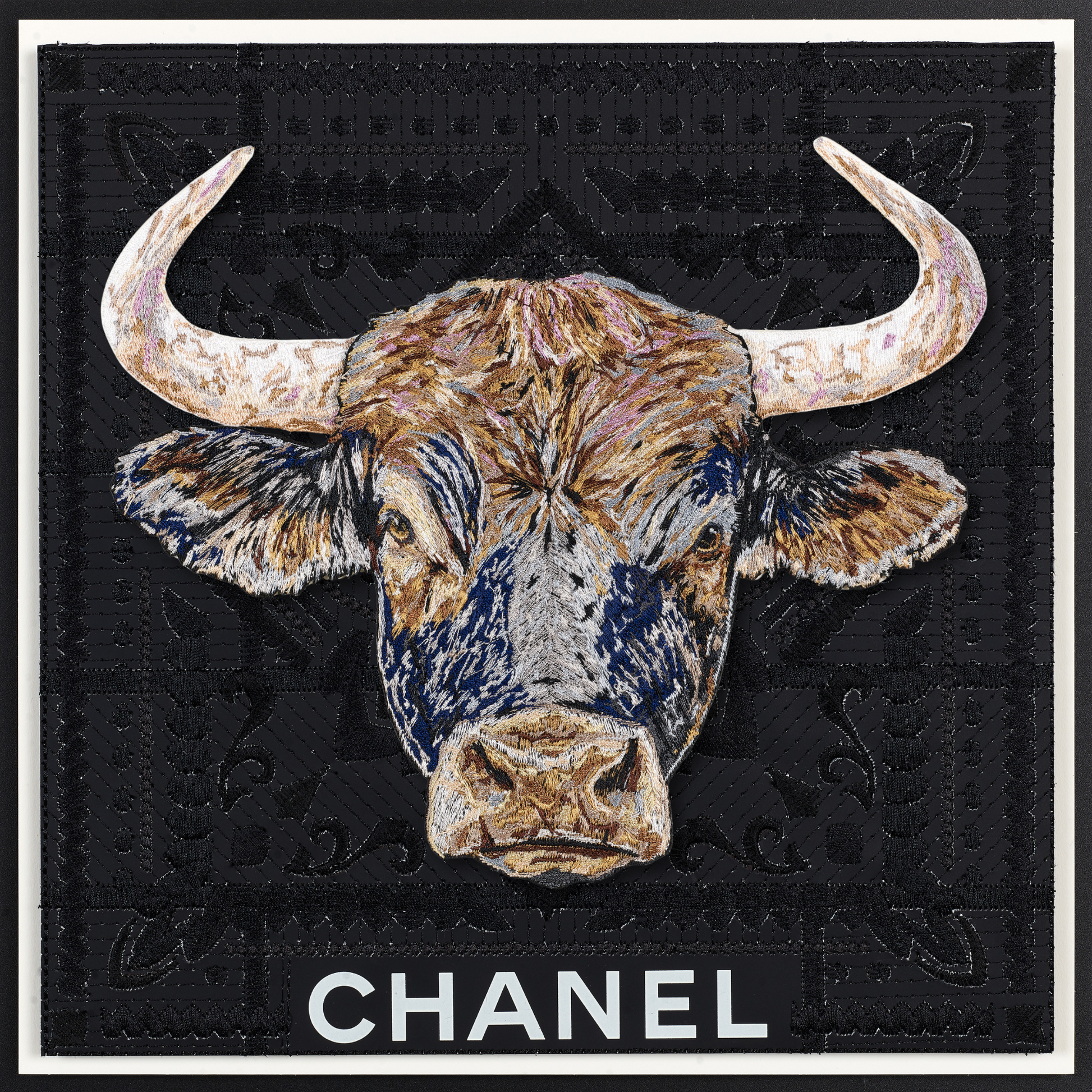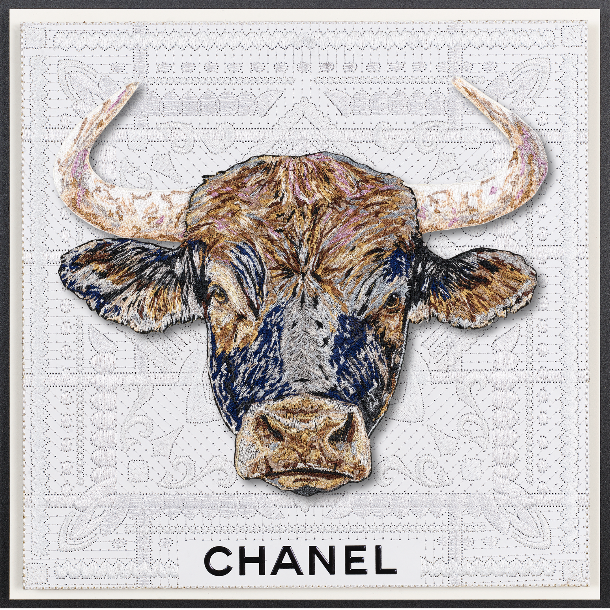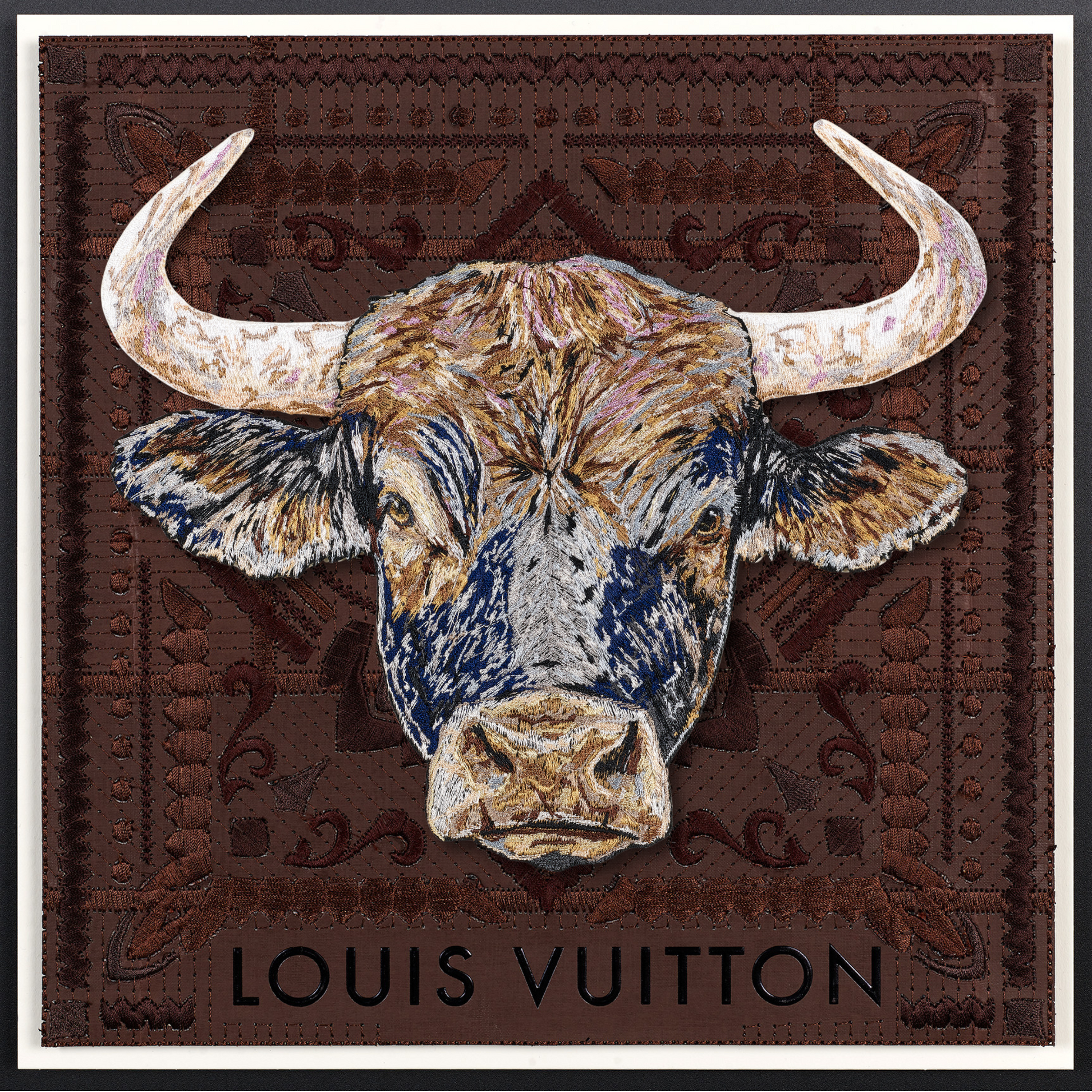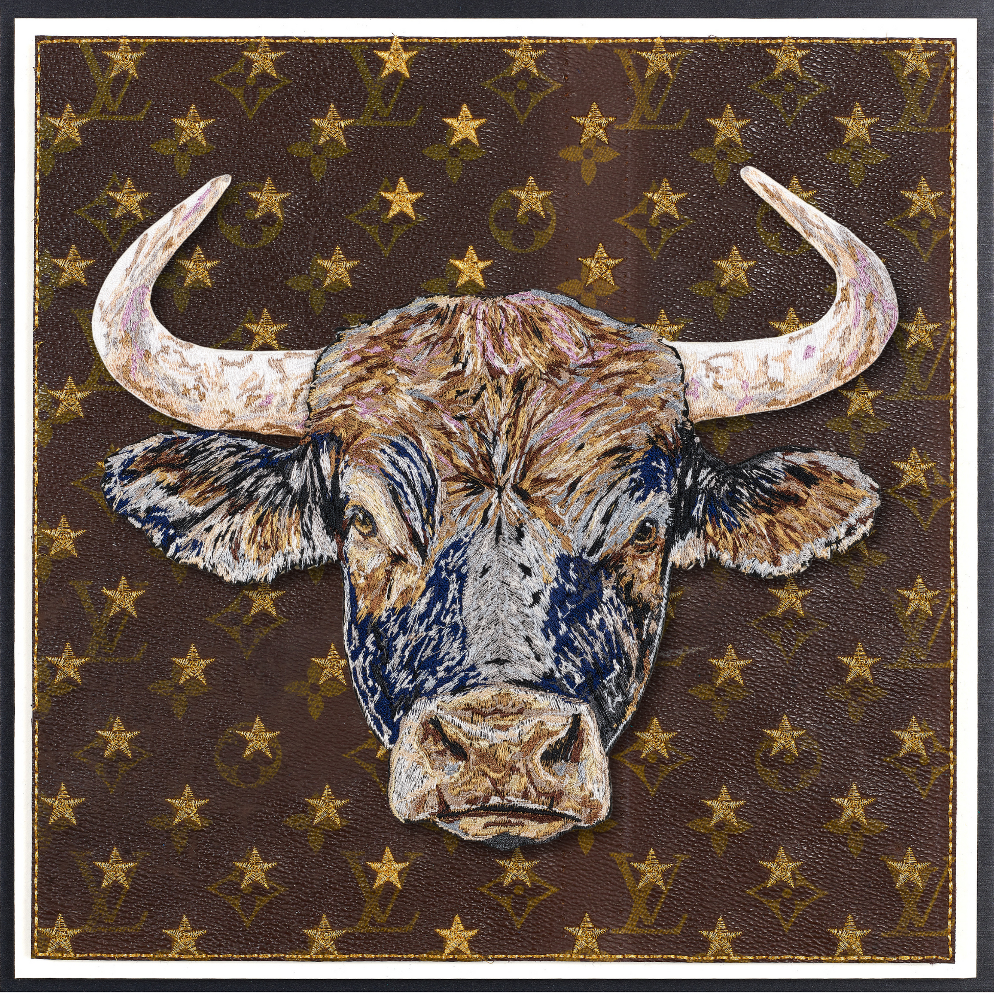 This piece intricately fuses vintage Western iconography with a modern take on upcycled luxury. The background is a compelling canvas—a deconstructed luxury shopping bag, the bags are embroidered, quilted together using intricate stitches and then mounted n a backboard. At the heart of the work, a monumental bull emerges, painstakingly stitched with over half a million threads in sumptuous shades of blue, steel, lavender, and caramel, infusing it with depth and vitality. Through days of precise embroidery, the bull was expertly hand-trimmed and mounted on clear acrylic, creating a striking three-dimensional relief that dramatically contrasts against the vintage fabric backdrop. This fusion of craftsmanship and reimagined luxury invites a dialogue between history, materiality, and contemporary art.