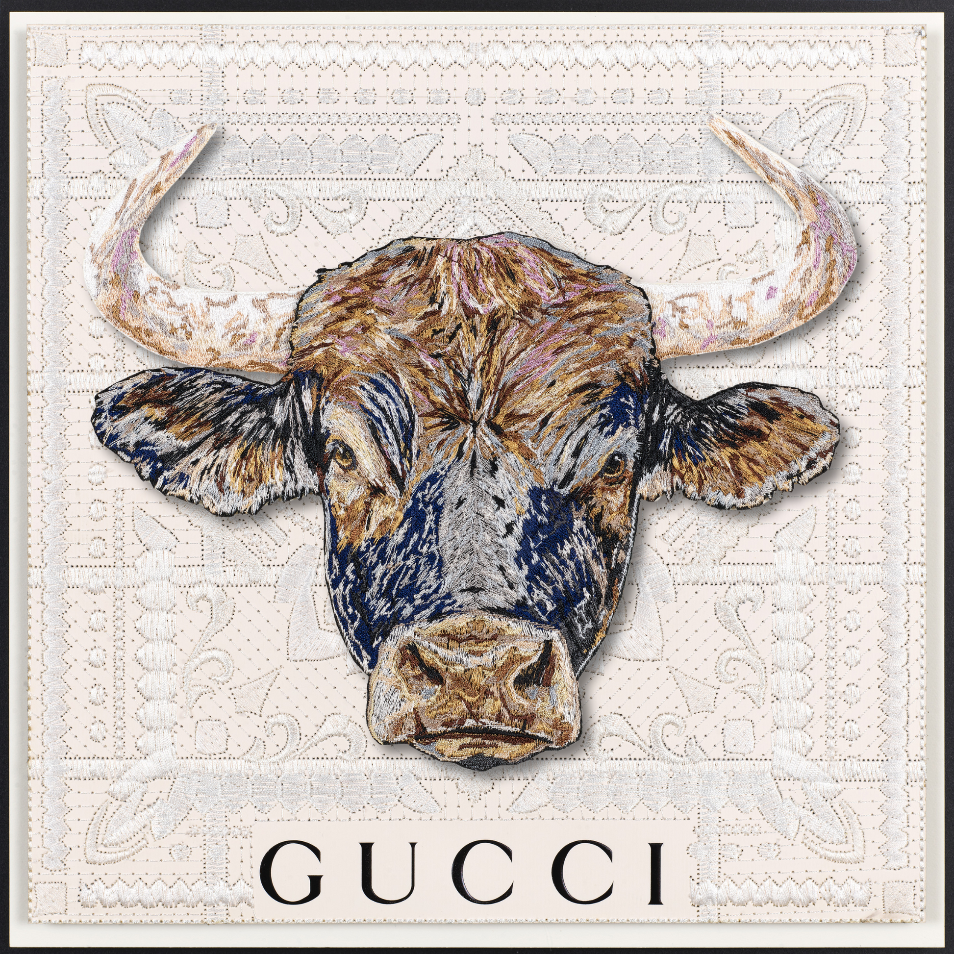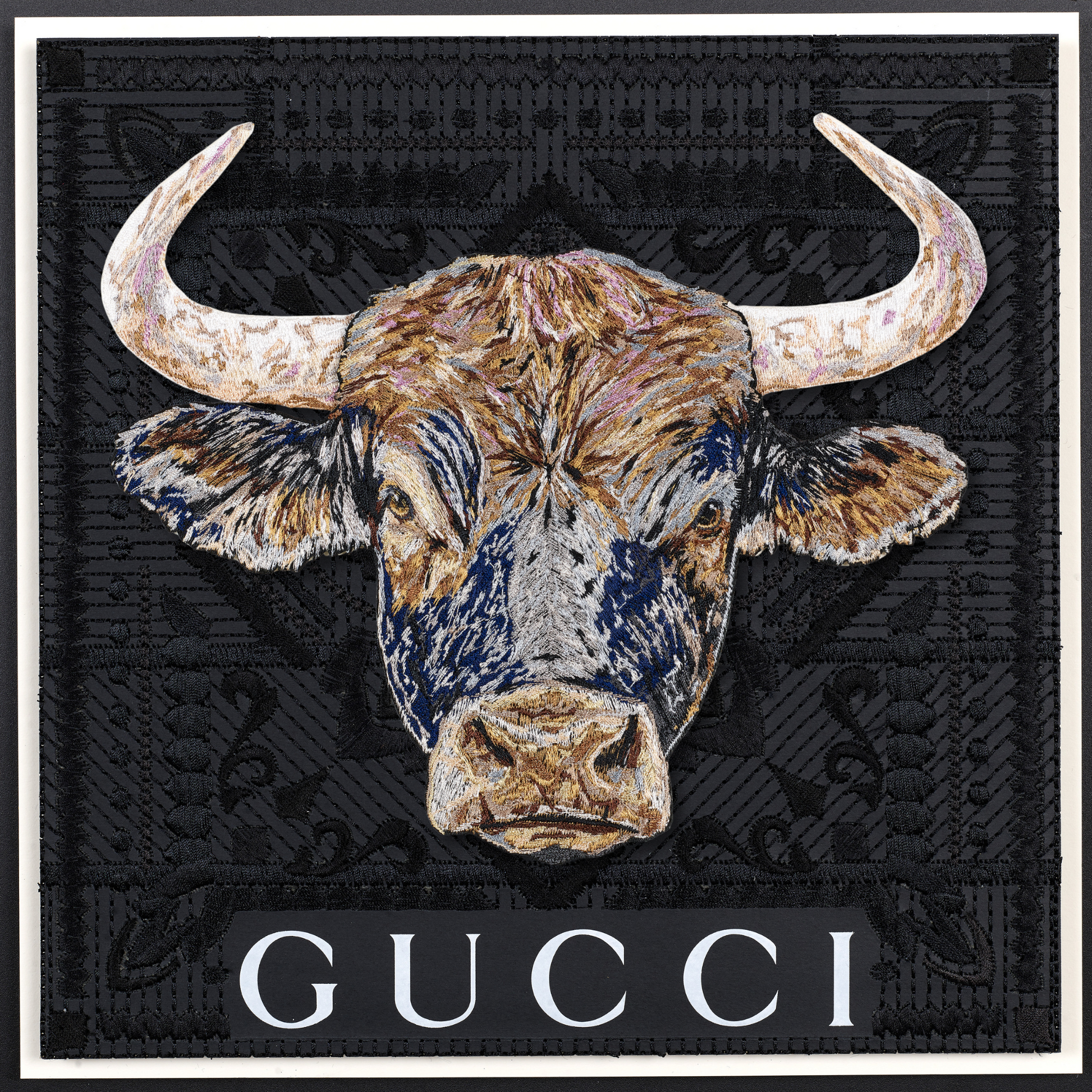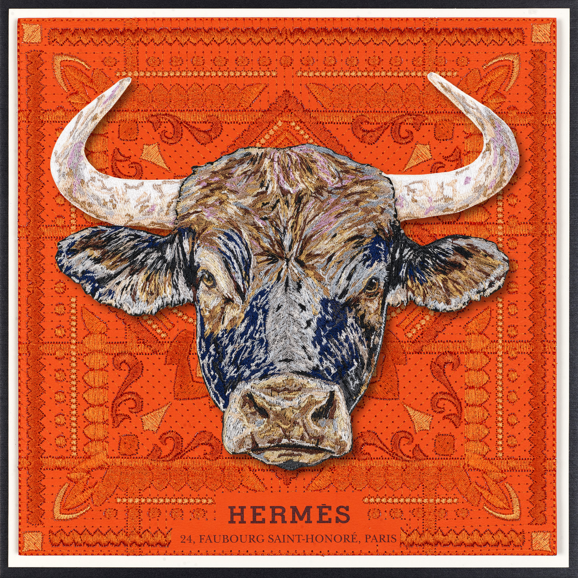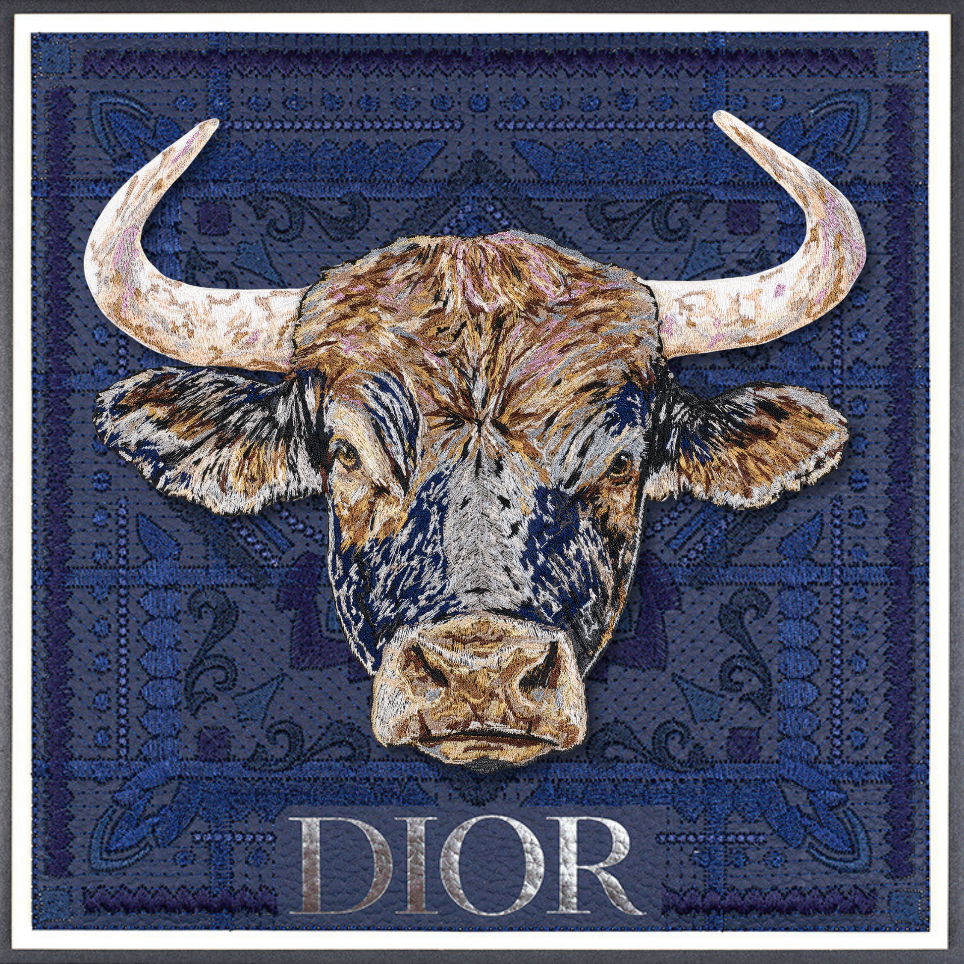 This piece intricately fuses vintage Western iconography with a modern take on upcycled luxury. The background is a compelling canvas—a deconstructed luxury shopping bag, the bags are embroidered, quilted together using intricate stitches and then mounted n a backboard. At the heart of the work, a monumental bull emerges, painstakingly stitched with over half a million threads in sumptuous shades of blue, steel, lavender, and caramel, infusing it with depth and vitality. Through days of precise embroidery, the bull was expertly hand-trimmed and mounted on clear acrylic, creating a striking three-dimensional relief that dramatically contrasts against the vintage fabric backdrop. This fusion of craftsmanship and reimagined luxury invites a dialogue between history, materiality, and contemporary art.