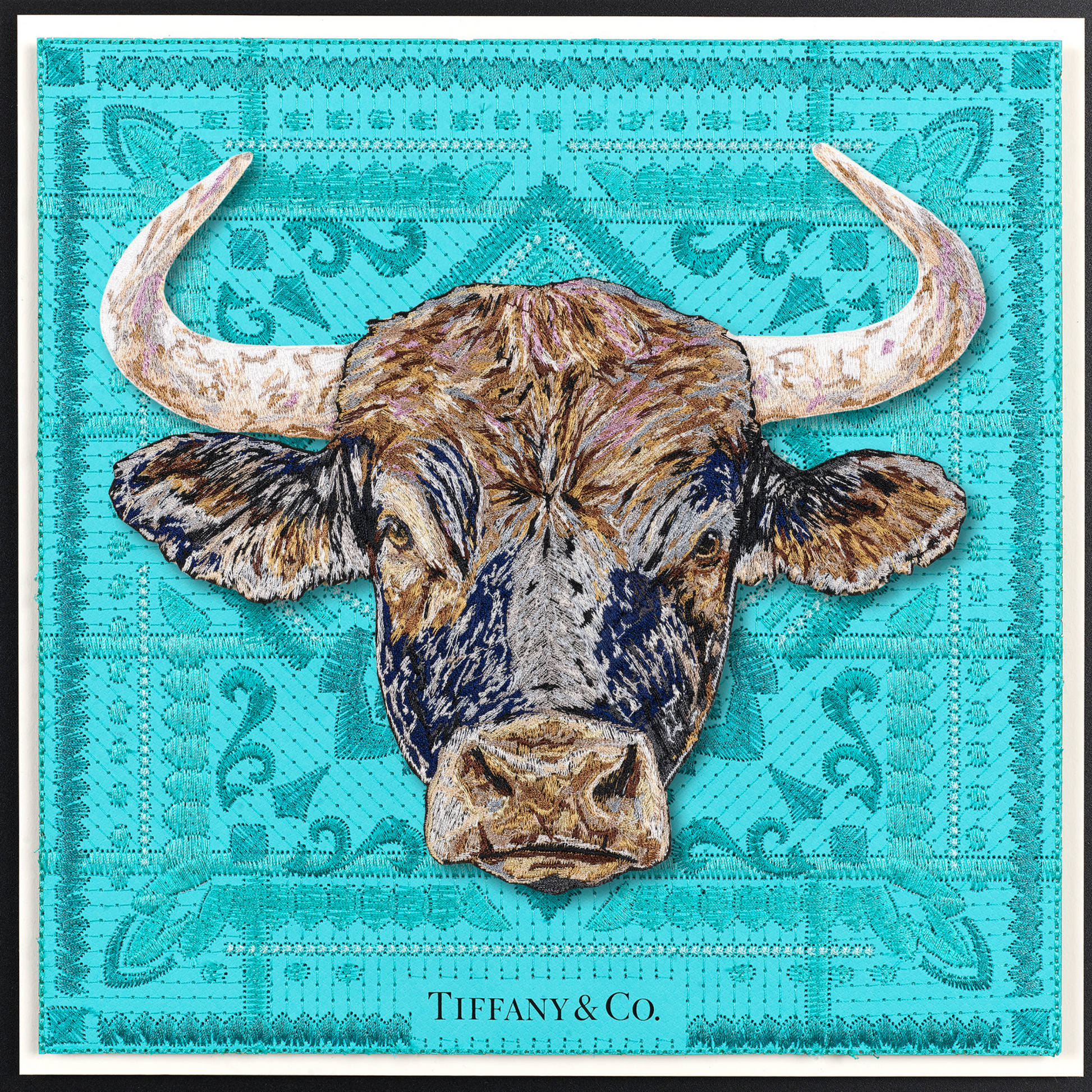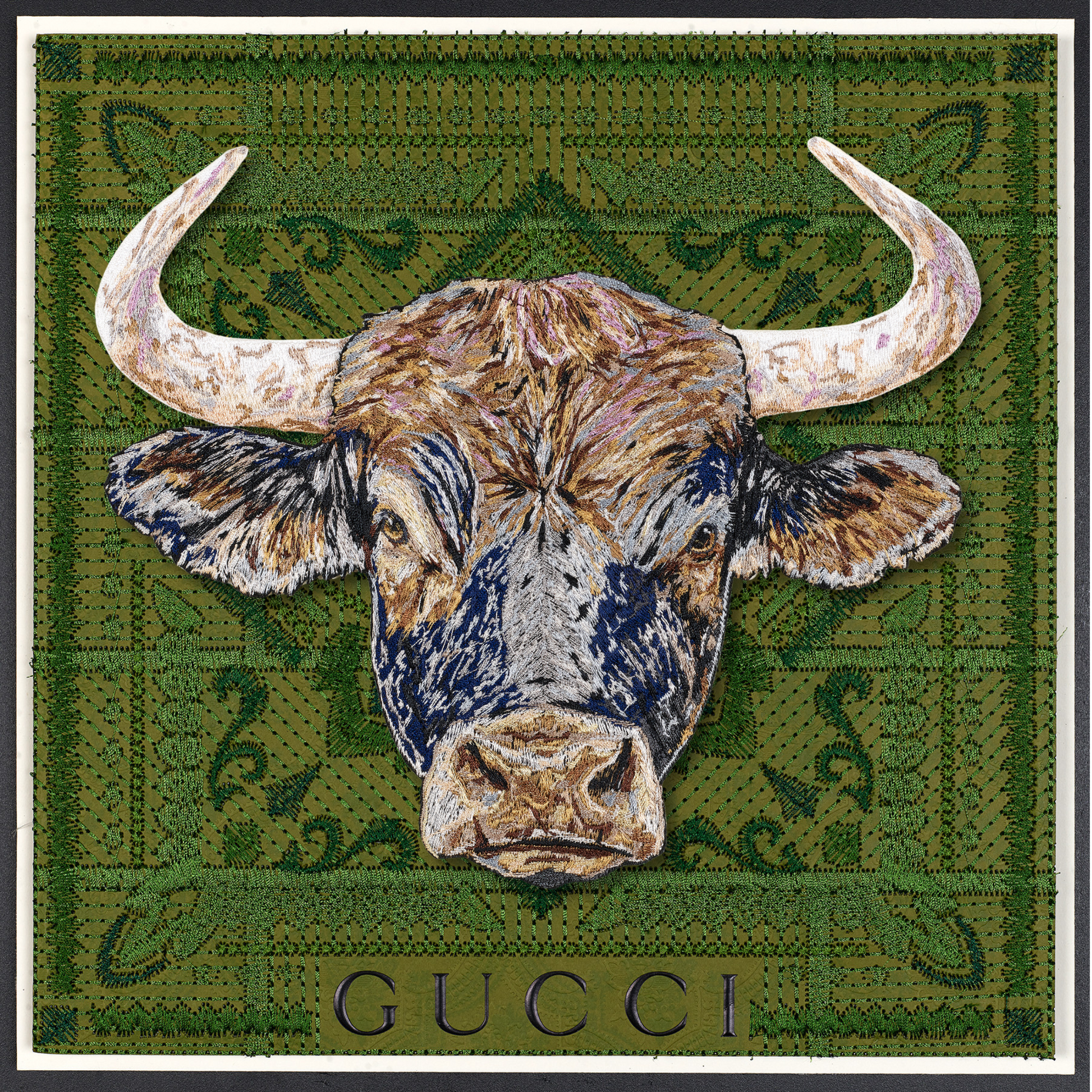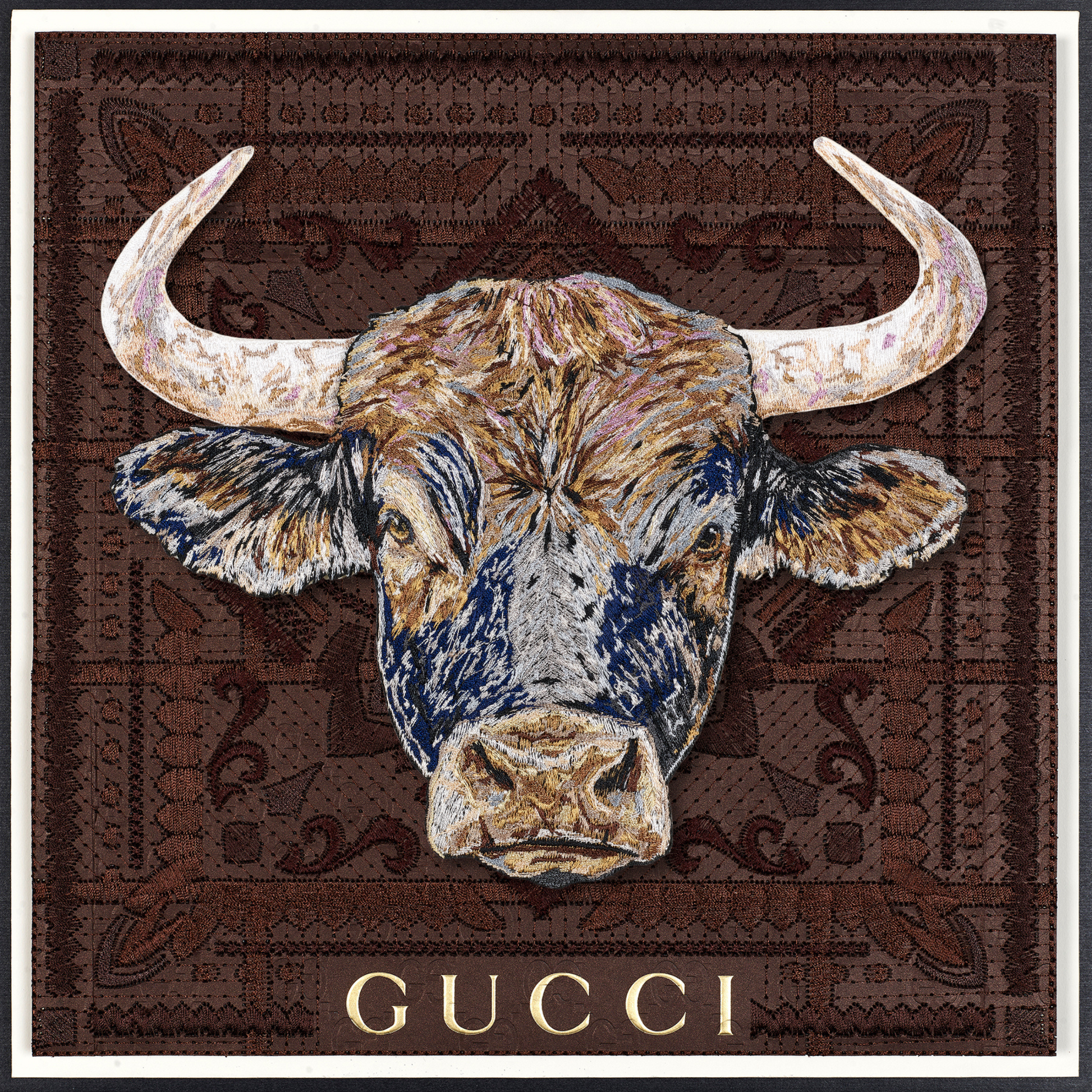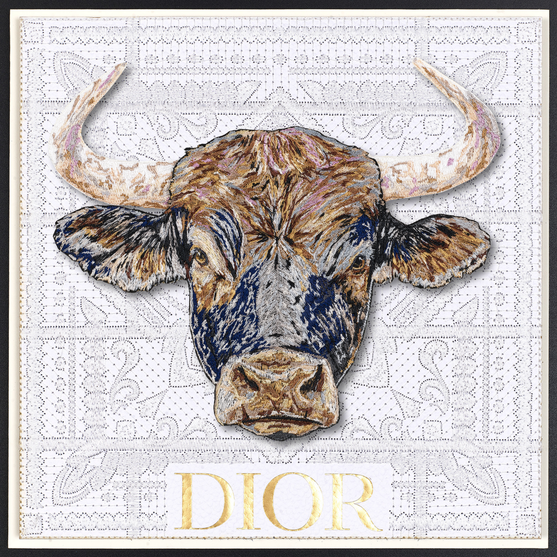 This piece intricately fuses vintage Western iconography with a modern take on upcycled luxury. The background is a compelling canvas—a deconstructed luxury shopping bag, the bags are embroidered, quilted together using intricate stitches and then mounted n a backboard. At the heart of the work, a monumental bull emerges, painstakingly stitched with over half a million threads in sumptuous shades of blue, steel, lavender, and caramel, infusing it with depth and vitality. Through days of precise embroidery, the bull was expertly hand-trimmed and mounted on clear acrylic, creating a striking three-dimensional relief that dramatically contrasts against the vintage fabric backdrop. This fusion of craftsmanship and reimagined luxury invites a dialogue between history, materiality, and contemporary art.