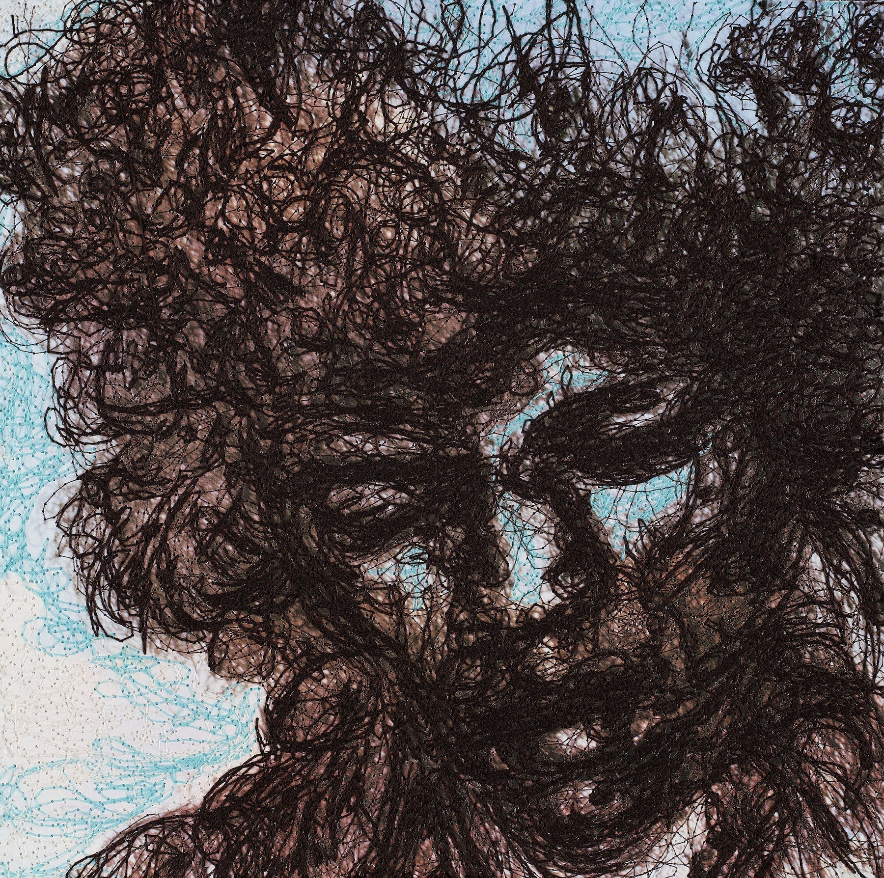 Creating the Cry of Love album was another natural choice. The stylized portrait of Jimi Hendrix just screamed embroidery to me. I have been creating embroideries in a sketch like style for many years and had just started creating them on album covers. Embroidery sketching is when I trace each thread over an existing image except I don’t stop to trim the thread, the design is created in one continuous line. Just like you would trace something with a pencil and never lift the pencil off of the paper. I created this piece with 24 layers of thread. The first two layers in thin rayon thread and the top two layers in thicker wool thread.