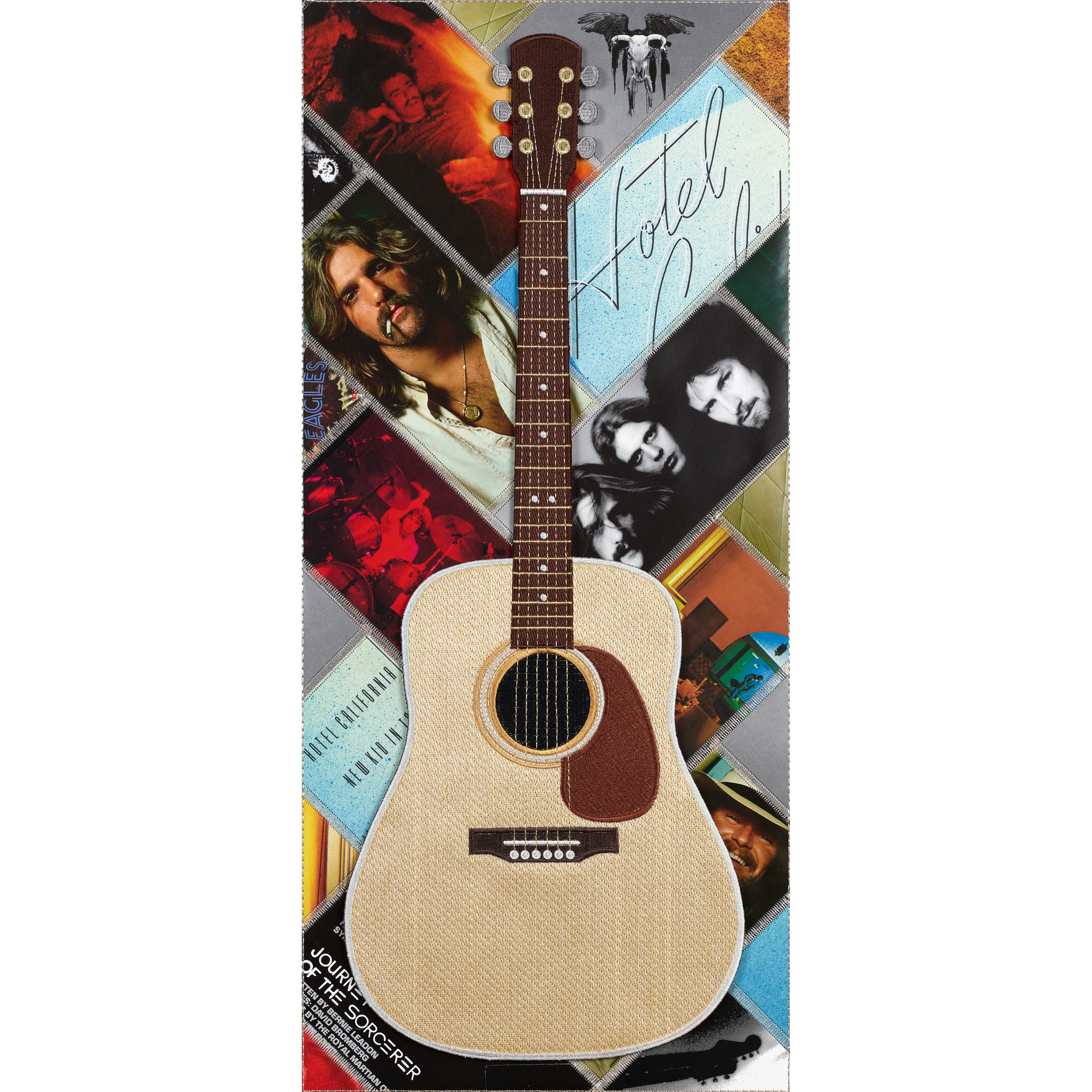 Each guitar is intricately embroidered, capturing the essence of vintage instruments with thread artistry. Over 150,000 meticulous stitches breathe life into these designs. The album series backgrounds showcase backgrounds created from vintage vinyl record sleeves