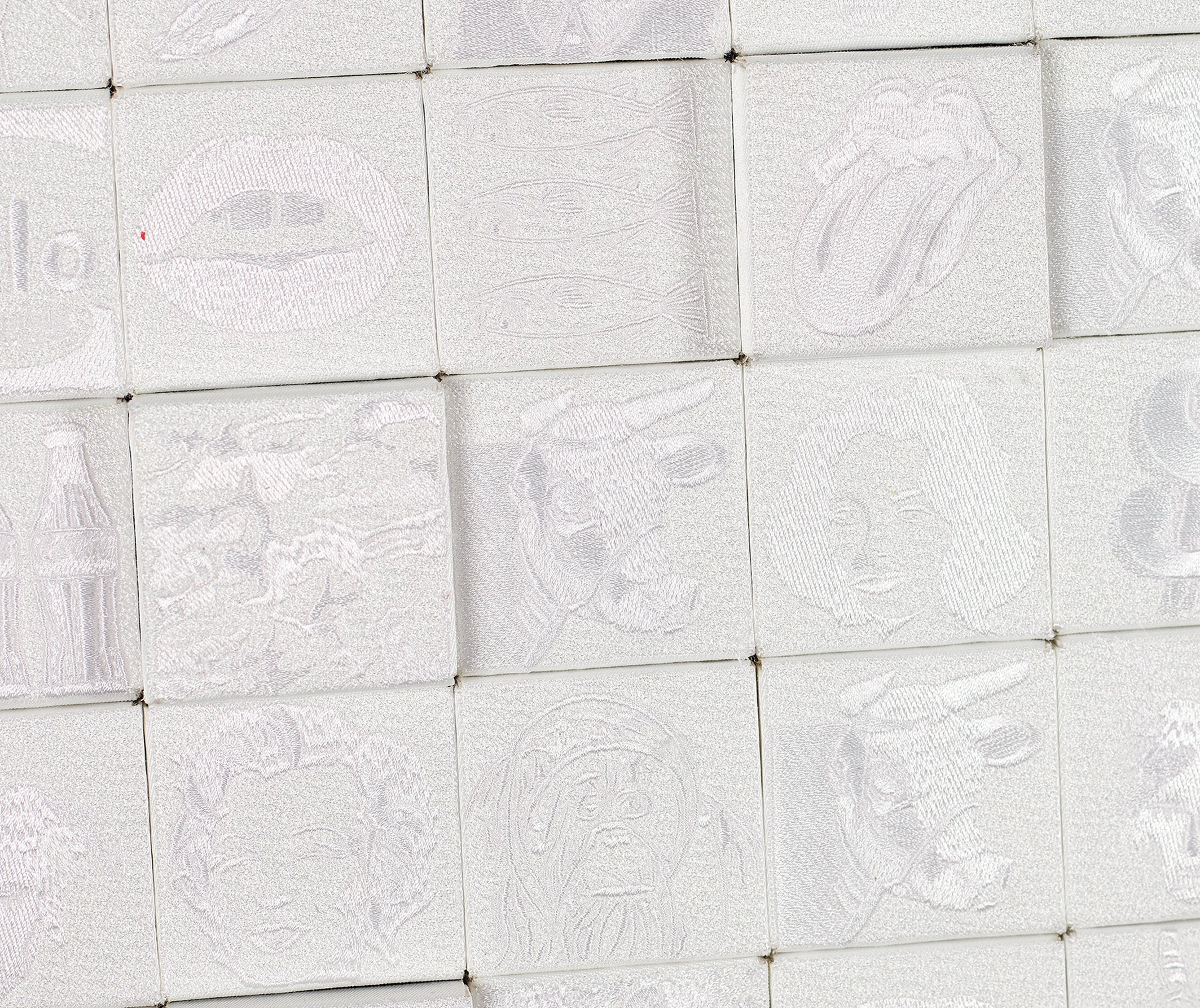 The mosaics tiles have been found in pieces I have created over the last 5 years, from my Americana series to the Shine a Light series and even as abstracts. The images or icons on each tile are hand digitized then each tile is individually embroidered and crafted as a separate piece and then combined to form an image. Some pieces contain hundreds of these individual pieces. The icons themselves also tell a story, and that story is different with each piece. Since each of these pieces contain hundreds of elements they are the hardest of my pieces to fabricate.