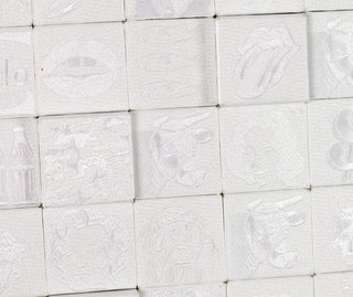 The album mosaics is an idea that was formulated while I was working on the album series. Since I embroider directly through the album covers I am limited by the size of the album to establish the finished piece. While there are a few albums that are double or triple foldouts, most albums are only 12”x12” in size. While I was looking at the installation wall I envisioned larger pieces and then it dawned on me how to accomplish that. I envisioned each album, recreated as a mosaic, with hundreds on 2”x2” tiles comprising the album cover.