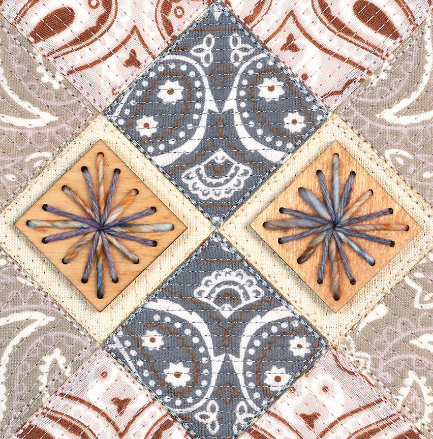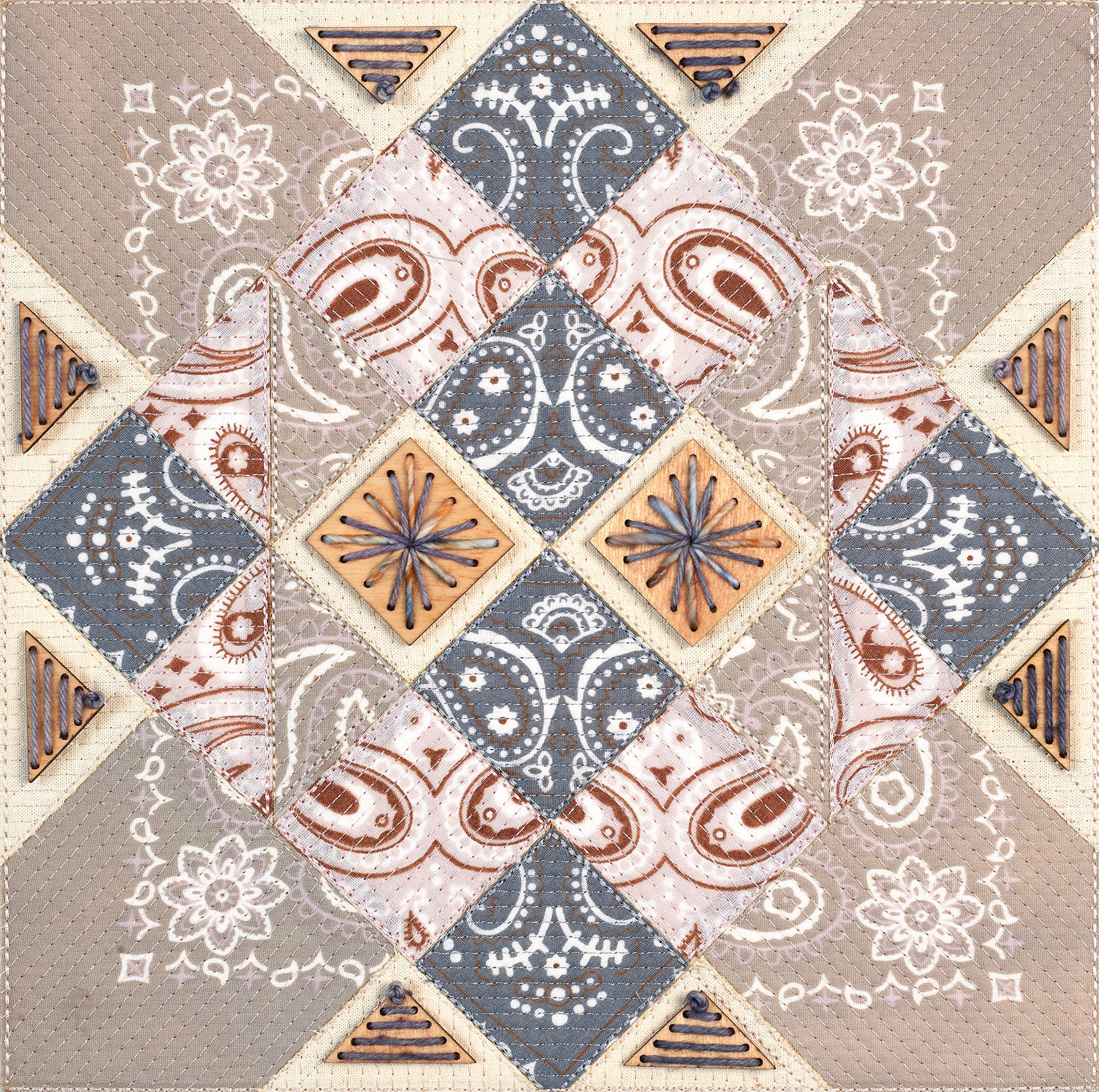These quilted panels mark a return to one of the earliest chapters of my practice as a designer. Before embroidery became my primary medium, I spent years immersed in the language of quilting—its geometry, its rhythm, and above all, its ability to tell stories through fabric. Over time, quilt-inspired backdrops have surfaced in different series, but for the Vintage Western works I wanted to bring them back with renewed depth and intention.