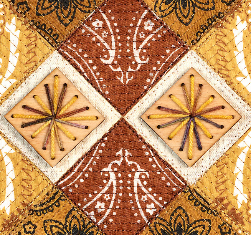 These quilted panels mark a return to one of the earliest chapters of my practice as a designer. Before embroidery became my primary medium, I spent years immersed in the language of quilting—its geometry, its rhythm, and above all, its ability to tell stories through fabric. Over time, quilt-inspired backdrops have surfaced in different series, but for the Vintage Western works I wanted to bring them back with renewed depth and intention.