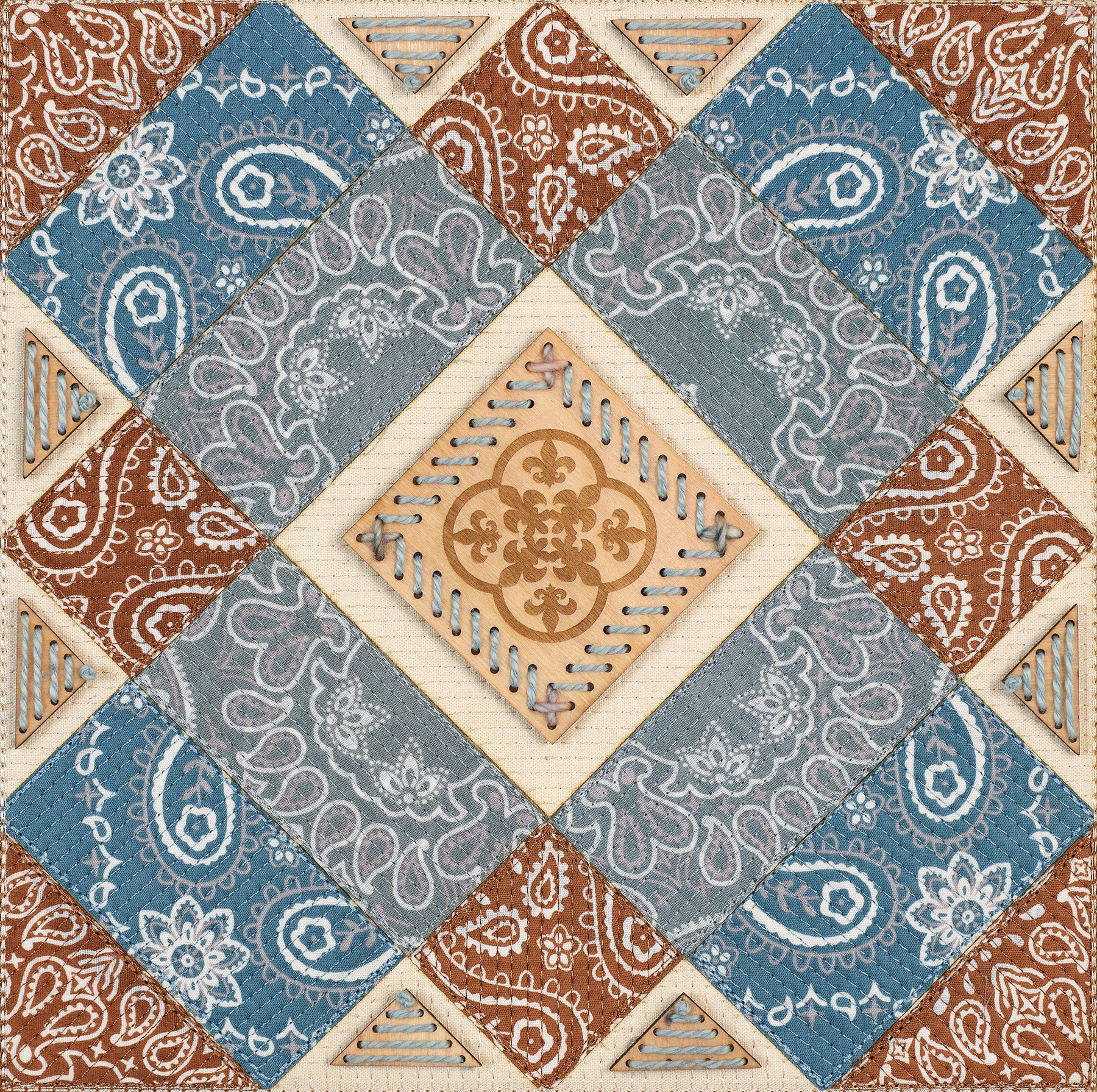 These quilted panels mark a return to one of the earliest chapters of my practice as a designer. Before embroidery became my primary medium, I spent years immersed in the language of quilting—its geometry, its rhythm, and above all, its ability to tell stories through fabric. Over time, quilt-inspired backdrops have surfaced in different series, but for the Vintage Western works I wanted to bring them back with renewed depth and intention.