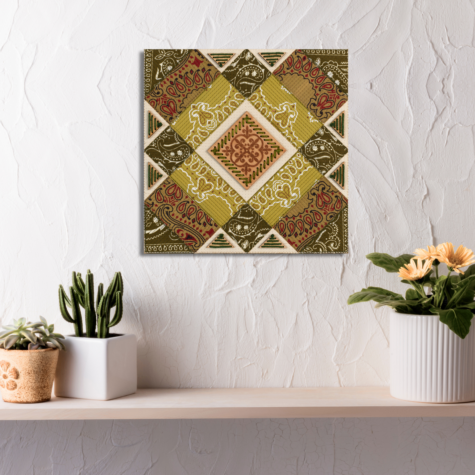 These quilted panels mark a return to one of the earliest chapters of my practice as a designer. Before embroidery became my primary medium, I spent years immersed in the language of quilting—its geometry, its rhythm, and above all, its ability to tell stories through fabric. Over time, quilt-inspired backdrops have surfaced in different series, but for the Vintage Western works I wanted to bring them back with renewed depth and intention.